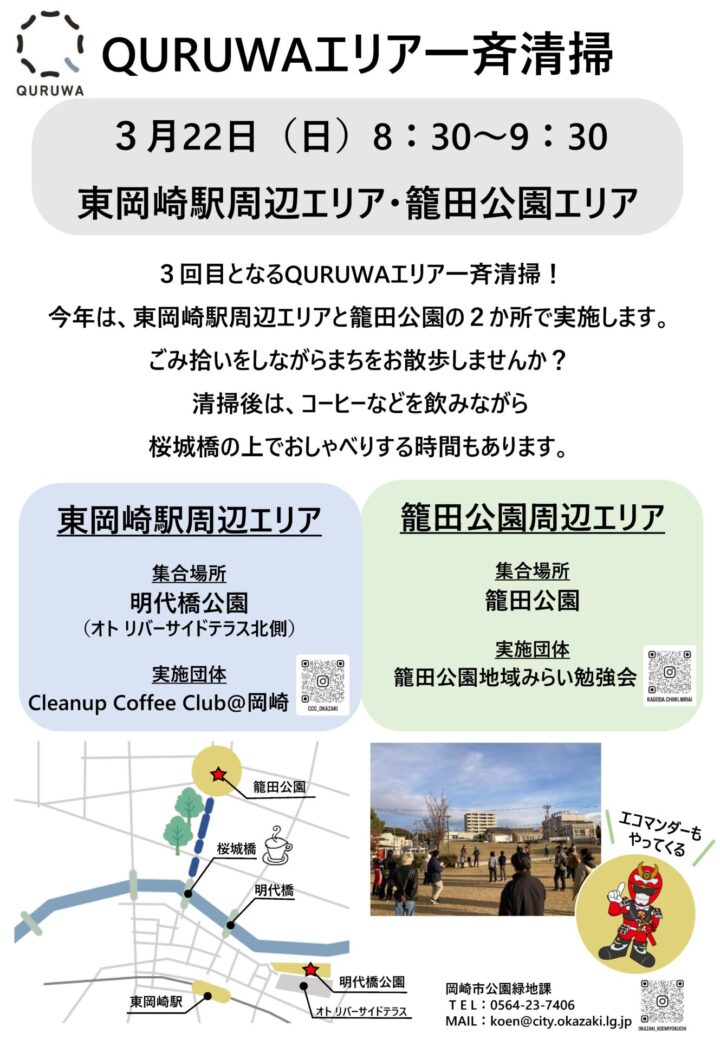 日ごろから清掃活動を実施している団体等の認知度向上や、エリアのきれいなまちづくり、そして顔の見える関係をつくり地域(まち)へ関わる機会を創出するために、東岡崎駅周辺、籠田公園 においてQURUWAエリア一斉清掃を実施します。清掃後は桜城橋に集まり、コーヒーなどを飲みながら参加者同士で話す場を設けます。 ぜひご参加ください。