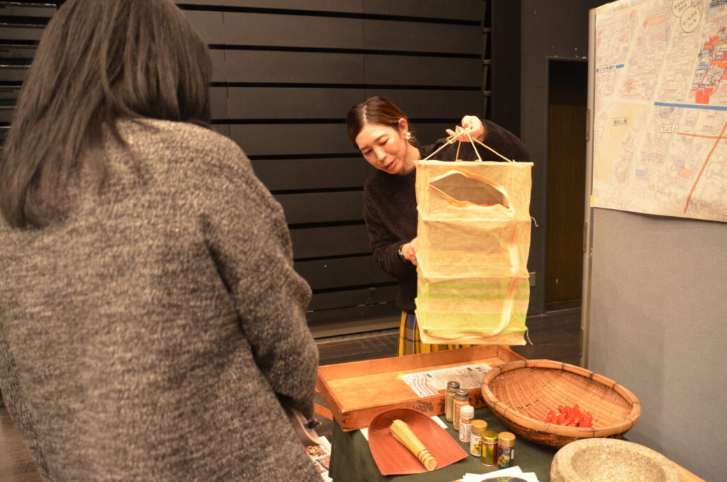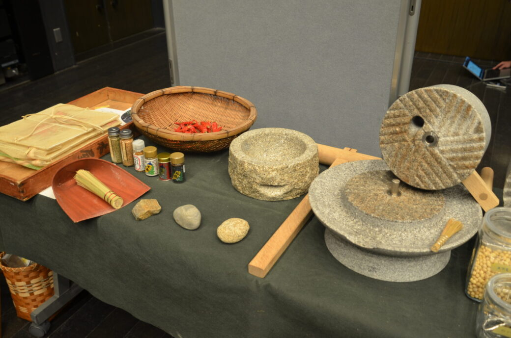 路地の空き家を活用したシェアハウスである「キノエノ*farm house」での、「路地ぐらし」のようすを紹介していました。実際に路地で収穫した作物の活用事例として、ゆず・大豆を使った加工品や、きな粉作り用の石臼の展示をおこないました。