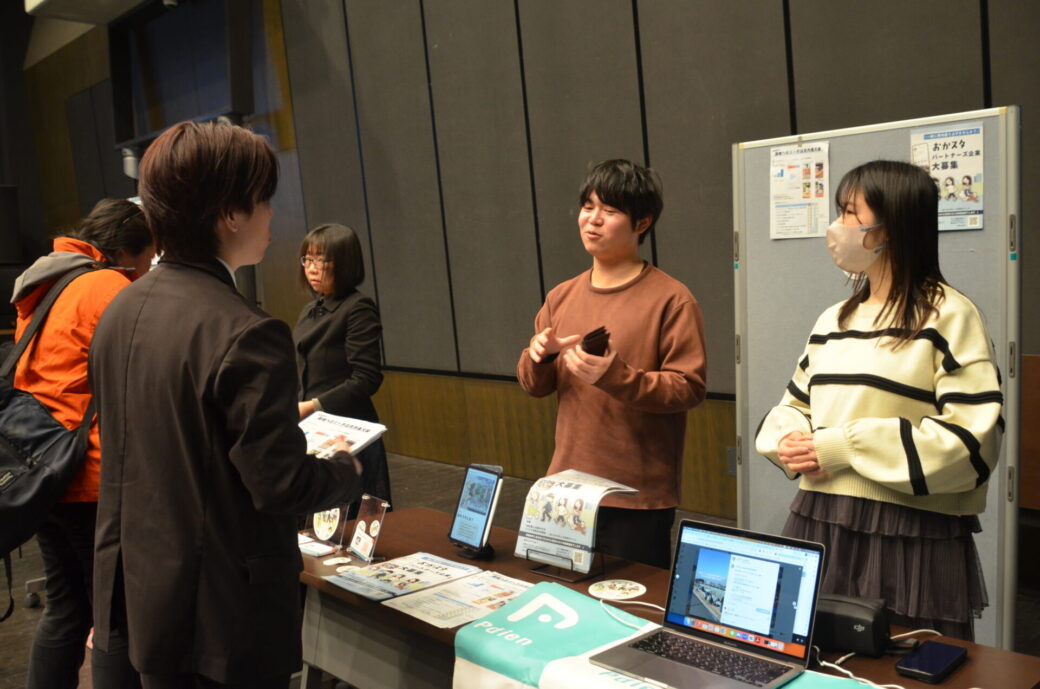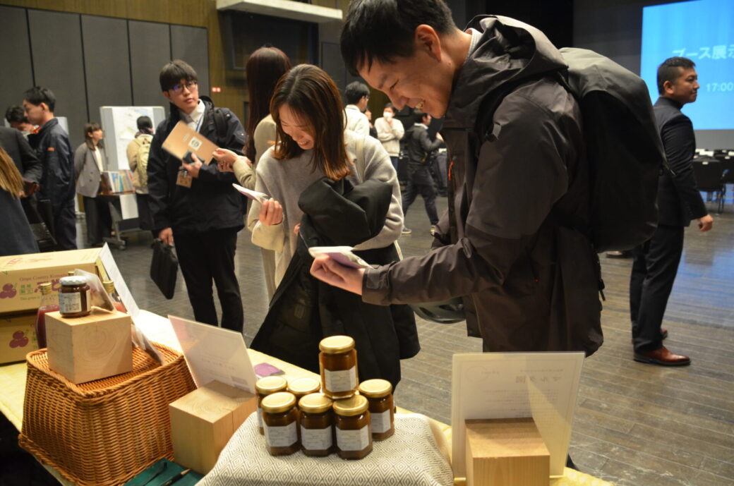 公開プレゼンの後は、各社がブースを出して、プロジェクトの紹介や商品を展示・販売しました。事業リノスクの受講生、行政職員、公開プレゼンおよびブース交流会を見に来た地域のかた、民間事業者さんどうしで交流を深め、新たなとりくみや連携のきっかけがうまれる場面がありました。ここからは各ブースの概要をお伝えします。