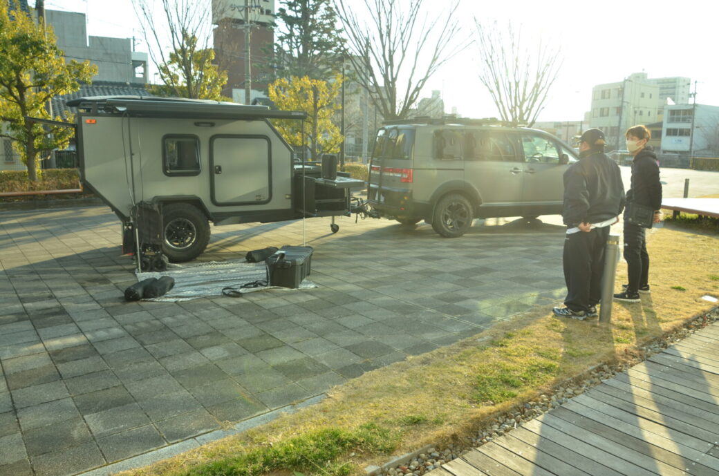 屋外にてキャンピングトレーラーの試作車を展示されていました。また、地域提携店での特別サービスを開始したカーシェア事業「narimobi」の紹介と、新規提携パートナーの募集をおこないました。