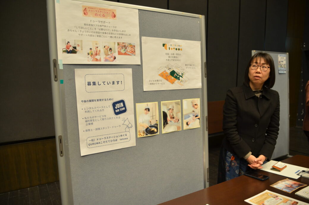 「こそだてひろばtetowa」での認可外保育やデイサービスの活動を紹介していました。特にこだわりのキッチンを通じた「産前産後のママへの食事支援」や、手作り料理の重要性についての展示をされていました。
